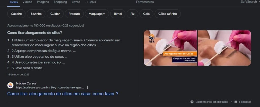 Palavra-chave “como tirar alongamento de cílios” – Outro sucesso! Também na posição zero, o arigo “Como tirar alongamento de cílios em casa” também se destacou como “Featured Snippet – trechos em destaque” (print tirado em 13/04/2024)